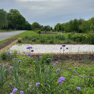 With the continued help of Edwin, the owner of Landscape Ex, we have placed weed barrier, bark, rocks and crushed shells around the three tree islands, on the four future rose and lily beds, around the Eleven Beds as well as creating definition for the allée of Hornbeams to the barn. I am including some before and after shots. These “toppings” have helped tremendously with weed control as well as the health of the trees and shrubs, because we are no longer hitting them with the mowers. I understand roses respond well to shell-type mulch. We have one more step before planting roses this fall, and that is to place some aluminum fence posts and wire behind the Inkberry holly shrubs to prevent deer browsing.